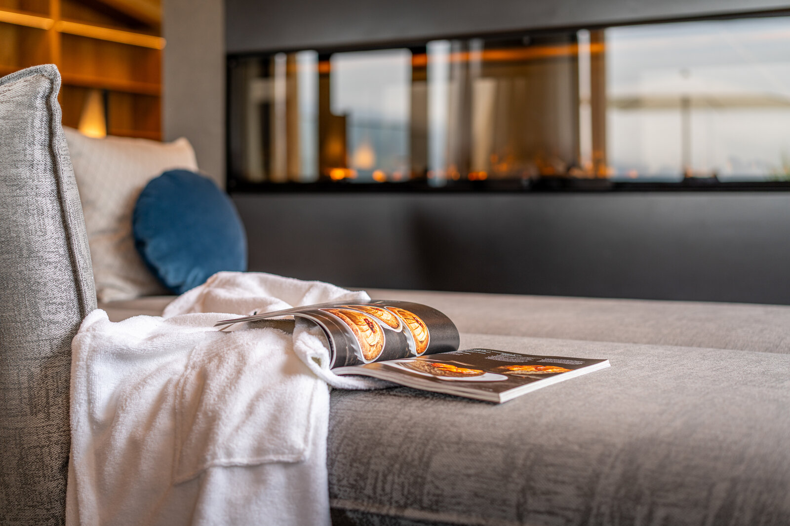 Ruheraum „Litnis“ – lichtdurchflutet, mit Panoramablick auf die Berge, Brunnen und Effektfeuer.