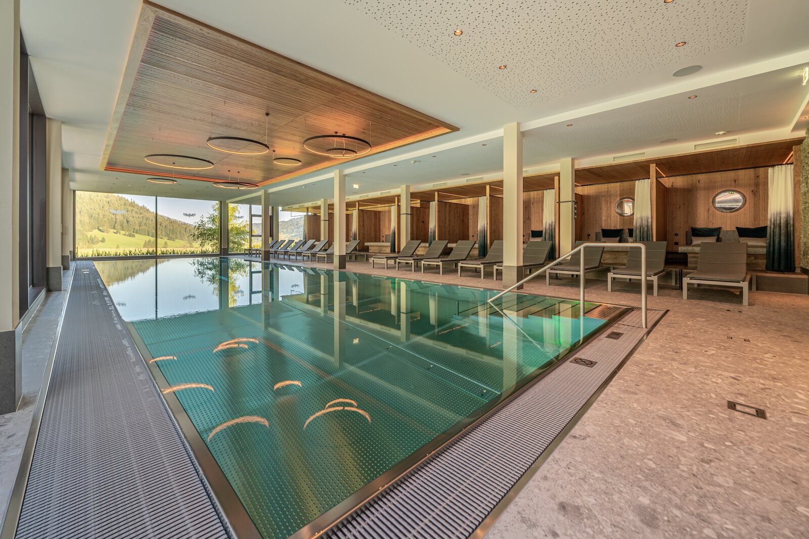 Innenpool „TalBlick“ – 18 x 5 m, wohlige 30 °C, umgeben von Ruheliegen in warmen Naturfarben.